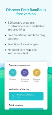Vstúpte do sveta všímavosti bez akýchkoľvek záväzkov. Bezplatná verzia Petit BamBou ponúka úvodné programy "Objavovanie" pre dospelých a "Objavovanie pre deti", tri rôzne denné meditácie podľa vášho výberu a rozsiahlu zbierku relaxačnej hudby pre sústredenie či zaspávanie. Animované príbehy vás hravo zoznámia so základmi vedomého bytia a neobmedzený prístup k nástroju voľného dýchania a meditácie vám pomôže pri relaxácii a cvičeniach srdcovej koherencie. Žiadne reklamy, žiadne požiadavky na platobné údaje – len čistá, ústretová podpora vašej cesty k duševnej pohode, doplnená o starostlivú zákaznícku službu. Kvalita obsahu je pre nás rovnako dôležitá ako jeho dostupnosť.